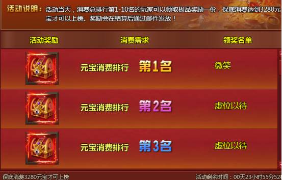 【活动内容】活动当天,消费总排行第1-10名的玩家可以领取专业品牌奖励一份,保底消费达到3280元宝才可以上榜。奖励会在结算后通过邮件发放!