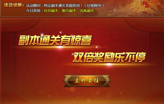 【活动内容】活动期间,特定副本通关奖励双倍!(经验除外)。