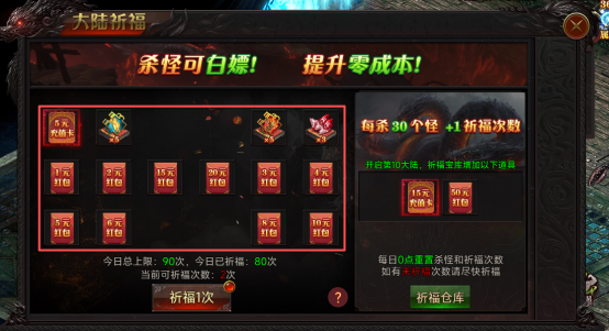 每杀30个怪物即可祈福1次,大陆等级越高获得的红包和充值卡的额度就越高,每天重置天天祈福天天领红包和充值卡
